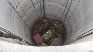 A pre-sink stage in a concrete-lined shaft with services erected, illustrating the structured approach that safeguards workers as infrastructure is progressively installed