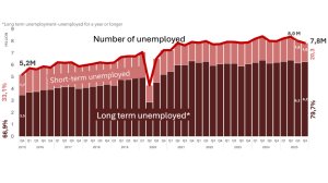 Between the fourth quarter of 2015 and the fourth quarter of 2025, the number of unemployed persons increased from 5.2-million to 7.8-million, with the proportion of those in long-term unemployment increasing from 66.9% to 79.7% over the same period.