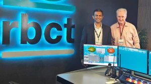 EFFICIENCY LEAP Engineering News & Mining Weekly’s Martin Creamer (right) with RBCT GM: Asset Management Kubendren Naidoo in the terminal’s automation control room, where Africa’s first fully autonomous stacker reclaimer is boosting coal handling efficiency while cutting energy use and emissions